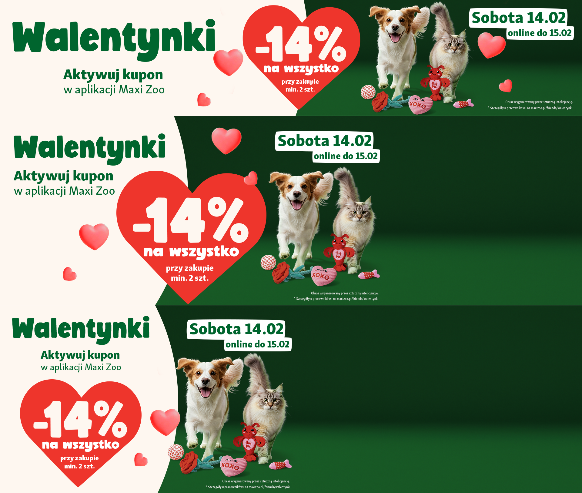 * Oferta 14% rabatu na wszystko obowiązuje w dniu 14.02.2026 r. w sklepach stacjonarnych oraz sklepie online, oraz w dniu 15.02.2026 r. w sklepie online, lub do wyczerpania zapasów, przy zakupach minimum 2 produktów, dla uczestników programu lojalnościowego Maxi Zoo zarejestrowanych do Friends. Warunkiem skorzystania z oferty jest aktywacja w aplikacji Maxi Zoo kuponu „Walentynki”. W sklepie stacjonarnym po aktywacji kuponu w aplikacji Maxi Zoo należy okazać kod QR aplikacji przy kasie podczas zakupu. W sklepie online po aktywacji kuponu w aplikacji Maxi Zoo rabat naliczy się automatycznie w koszyku. Rabat naliczany jest od cen regularnych. Kupon można wykorzystać tylko raz. Oferta nie łączy się z innymi promocjami i obniżkami cen, w tym innymi kuponami. Szczegóły u pracowników i na maxizoo.pl/friends/walentynki
