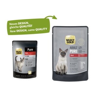 SELECT GOLD Adult Pure to pełnowartościowa karma (nie ma potrzeby dokarmiania). Zawsze zapewnij swojemu kotu świeżą wodę do picia. Podczas zmiany diety stopniowo zastępuj dotychczasową karmę SELECT GOLD Adult Pure w sosie (przez około tydzień). W ten sposób zapewnisz optymalną tolerancję i akceptację również w fazie przejściowej.