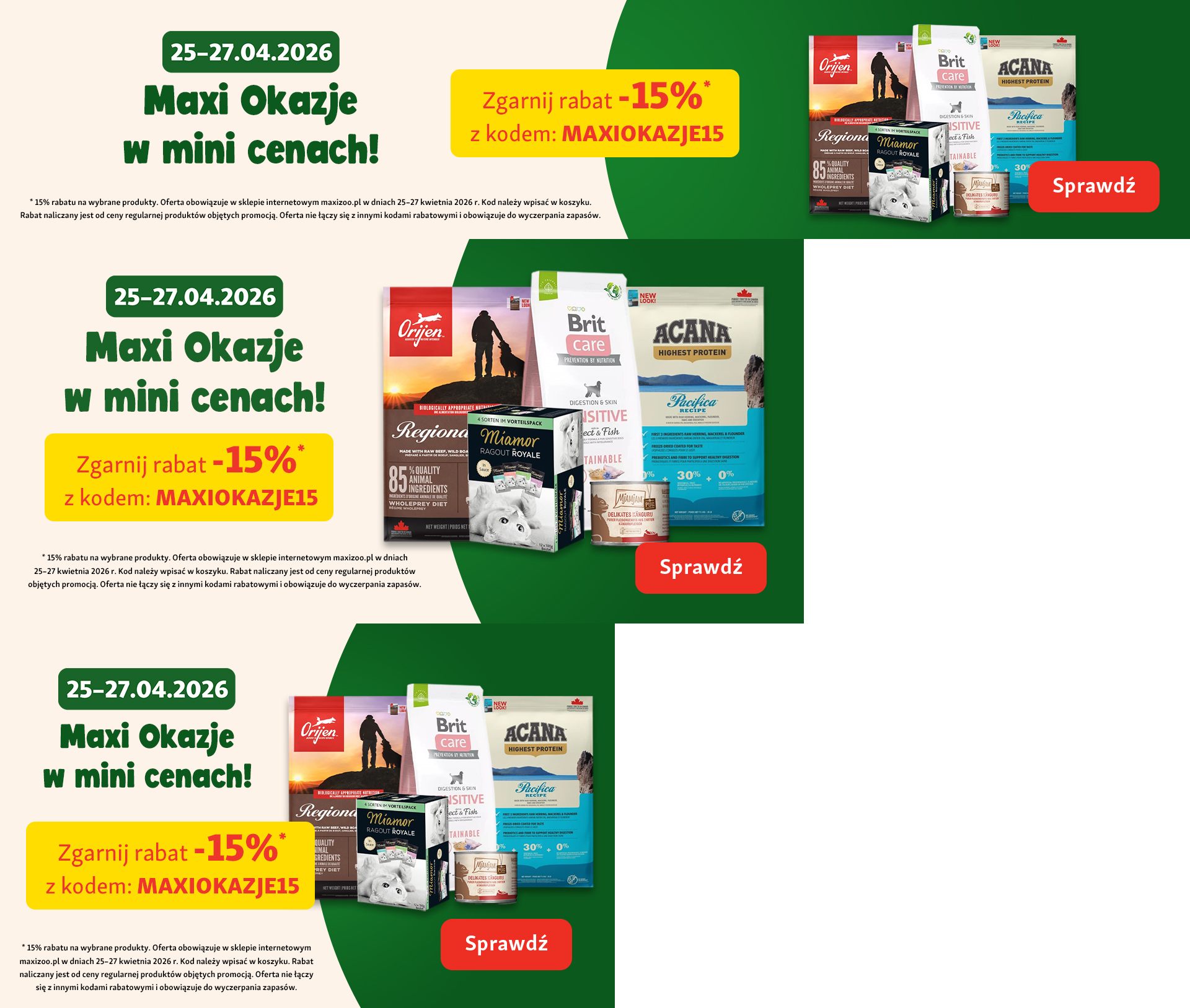 *15% rabatu na wybrane produkty . Oferta obowiązuje w sklepie internetowym maxizoo.pl w dniach 25–27 kwietnia 2026 r. Kod należy wpisać w koszyku. Rabat naliczany jest od ceny regularnej produktów objętych promocją. Oferta nie łączy się z innymi kodami rabatowymi i obowiązuje do wyczerpania zapasów.